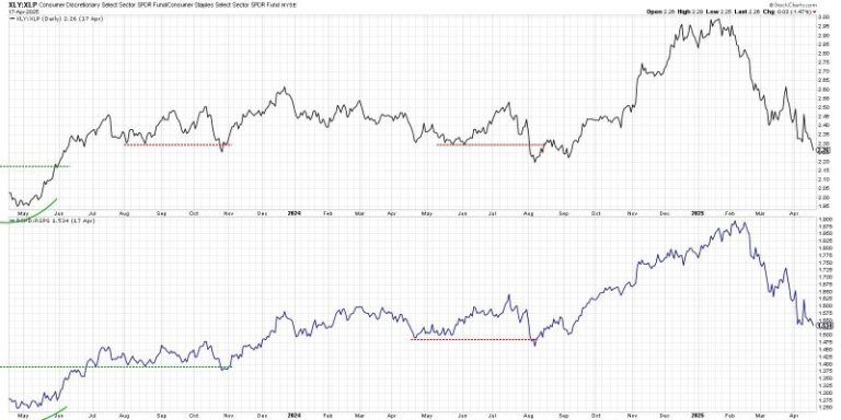 We can see that the cap-weighted version of this ratio made a peak in January, while the equal-weighted version made its own top in February. Both ratios have been in a fairly consistent downtrend of lower highs and lower lows, even through last week’s sudden spike on tariff policy changes.